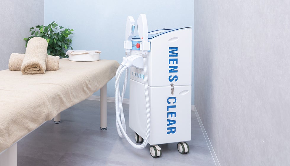 【 POINT.1 】最新の脱毛機『クリアプロ』を使用し痛みを軽減メンズクリアは、IPL(熱破壊式)×SHR(蓄熱式)のハイブリッド脱毛機を使用しています。照射面には光を効率的に通すクリスタル・サファイアを使用し、肌に接する部分をマイナス4度まで冷却しています。それにより脱毛照射時に発生する熱を緩和し、痛みを軽減しています。