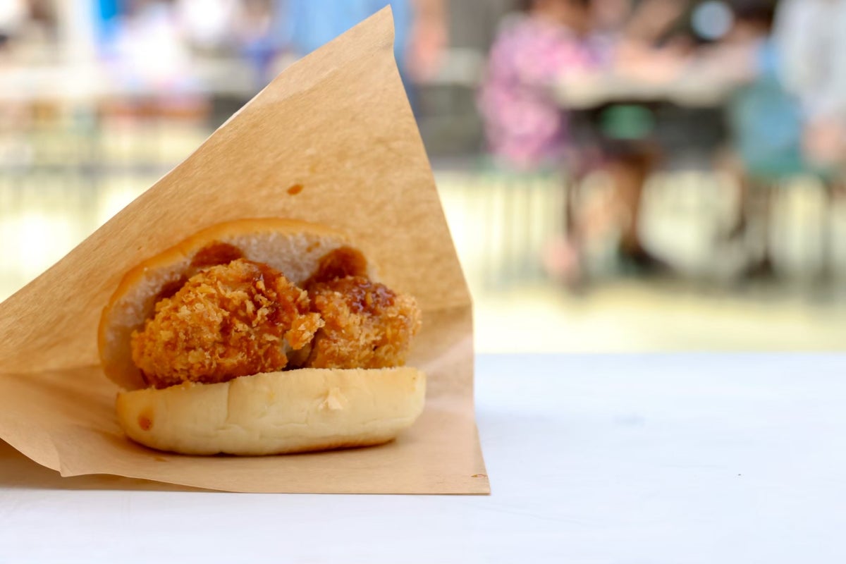 上野発祥で現代ではメジャーな料理の一つとなった「とんかつ」。今回は学生が、上野でのお祭りで上野の地発祥の料理を味わってほしいという思いから商品開発を行いました。お祭りでは、パンのバターの風味ととんかつの塩味がどちらも感じられるよう、とんかつ単体ではなく「とんかつサンド」として販売しました。