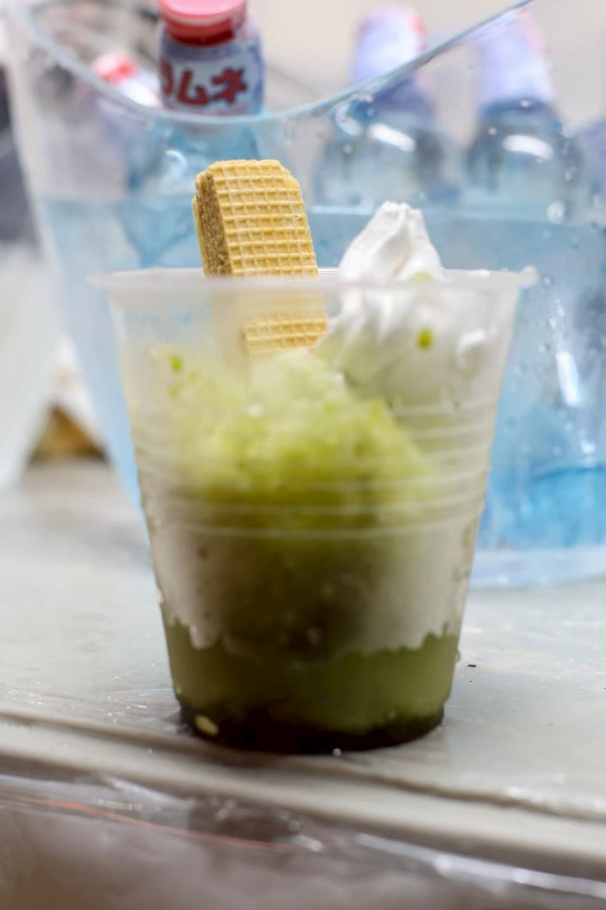 冷茶は、過去に「茶の君野園」とコラボしてパッケージを作成した際にも使用した八女茶を使用した。抹茶かき氷は、子供でも食べられるよう抹茶の渋みと甘みをうまく組み合わせることを意識し、練乳やビスケットなど甘くできる要素を取り入れた。
