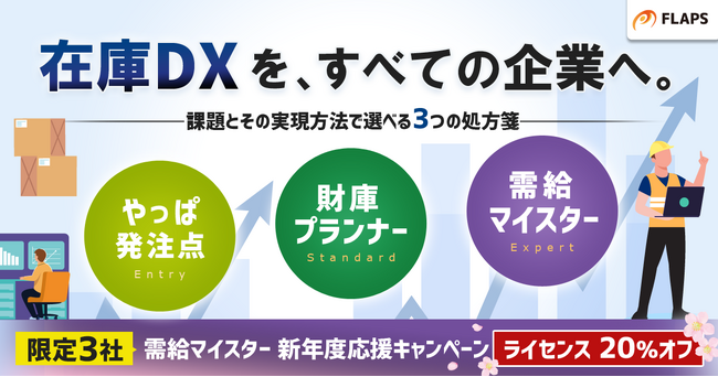 【新年度の在庫DX】FLAPS「在庫最適化シリーズ」全3種公開。4月からの本格導入に向け、限定3社の「需給マイスター」新年度応援キャンペーン ライセンス20%オフの受付を開始!