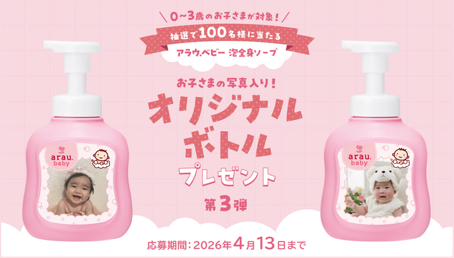 お子さまの写真入りボトルが100名様に当たる! アラウ.ベビー 泡全身ソープ オリジナルボトル プレゼントキャンペーン第3弾を開始