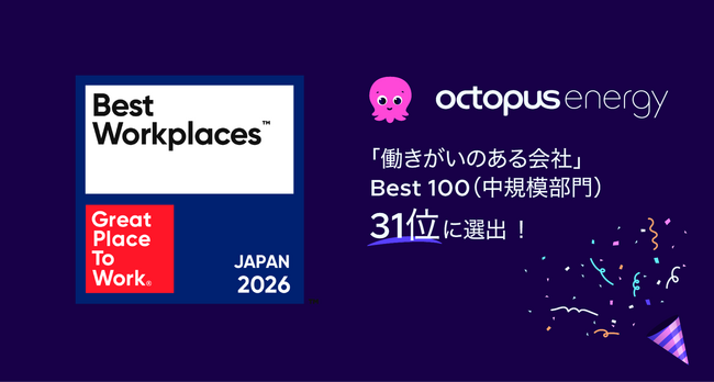 日本の電力市場でトップ成長率を記録したオクトパスエナジー、「働きがいのある会社」ランキング Best 100(中規模部門)31位に選出!