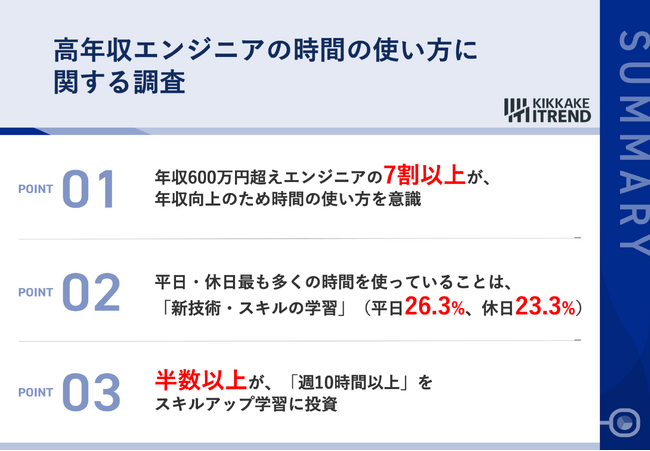 【年収600万円超え高年収エンジニアの時間の使い方とは】7割以上が、年収向上のため時間の使い方を意識、平日・休日問わず「スキル学習」に最も時間を投資