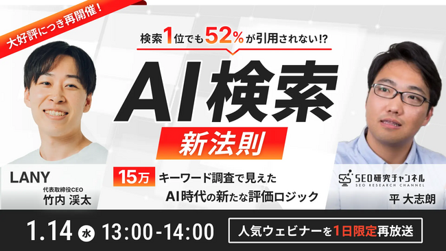 【無料アーカイブ放送】AI検索の新法則|検索1位でも52%が引用されない!?15万キーワード調査で見えたAI時代の新たな評価ロジック を1/14(水)に再開催