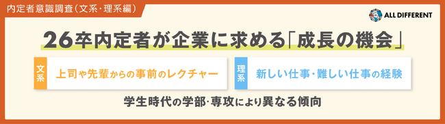 26卒内定者が企業に求める成長の機会……文系は「上司や先輩からの事前レクチャー」、理系は「新しい仕事・難しい仕事の機会」