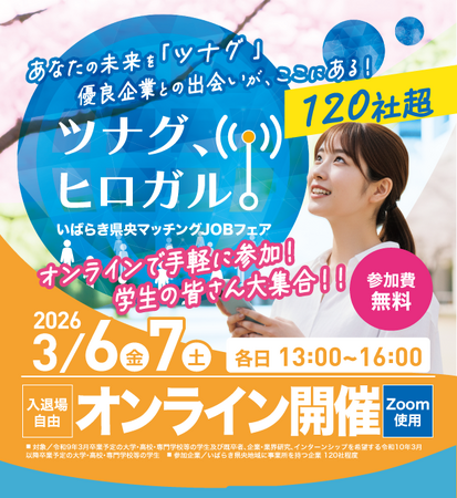 【就職課の皆様】さぁ就活始めよう!学生大集結・オンライン限定イベントで優良企業や自治体に一気に出会える【参加無料】【いばらき県央地域】3月スタートダッシュで”リアル”な生情報にタッチ!