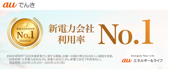 auでんき、MMD研究所による「2025年新電力に関する調査」で利用している新電力会社1位を獲得