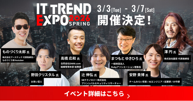 業界最大級オンライン展示会「ITトレンドEXPO2026 Spring」申込み受付中! お笑い芸人野田クリスタル氏、サイバーセキュリティに精通する辻 伸弘氏など各業界を代表する豪華ゲストが続々決定