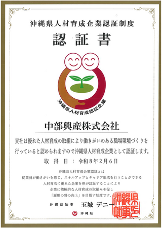 「人を人財に」中部興産、沖縄県人材育成企業認証制度の認証を取得