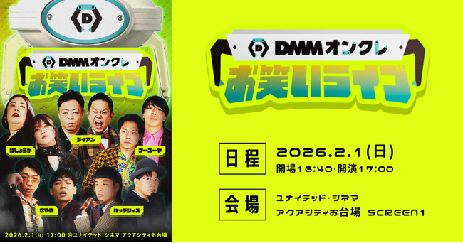 ダイアン・さや香・紅しょうが・フースーヤ・バッテリィズ、人気芸人5組が登場!「DMMオンクレお笑いライブ」を2026年2月1日(日)にお台場で開催決定!