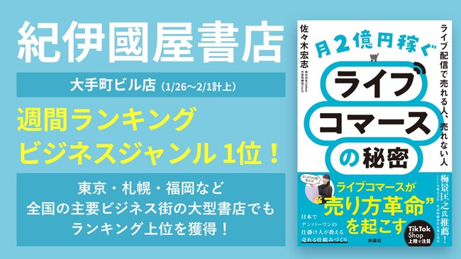 Cellest代表取締役CEO・佐々木宏志著『月2億円稼ぐライブコマースの秘密 ~ライブ配信で売れる人、売れない人~』紀伊國屋書店 大手町ビル店 ビジネスジャンル1位!