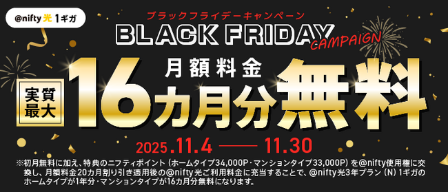 ニフティ、「@nifty光 3年プラン(N)」の利用料金が実質最大16カ月分無料となる「BLACK FRIDAYキャンペーン」を実施