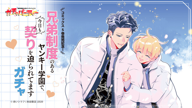 コミックス5巻発売記念!『兄弟制度のあるヤンキー学園で、今日も契りを迫られてます』秋田書店公式オンラインくじ【ガチャパーティー】に登場! 12月16日(火)より販売開始!