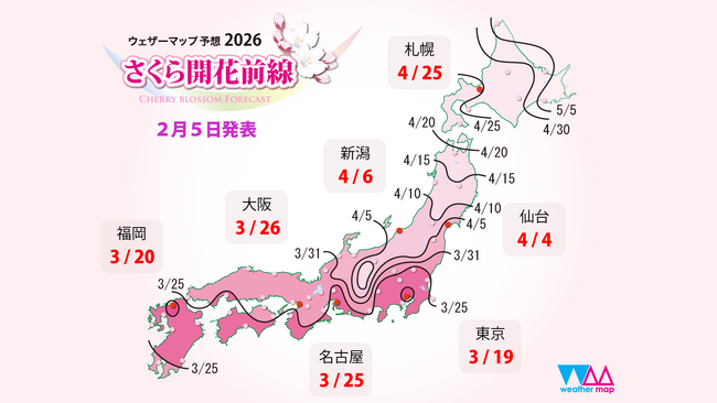 2026年第二回「さくら開花予想」ウェザーマップ発表 西日本は平年並み、東日本はやや早め、北日本では早い開花の予想全国で最初の開花は東京で3月19日頃