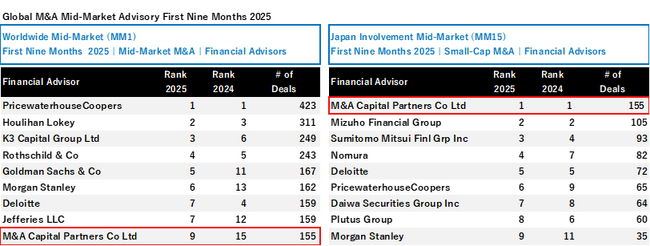 2025年1月~9月 中規模・小規模市場M&Aリーグテーブルワールドワイド案件数ランキングにて上半期に続きトップ10入り、日本市場では1位を獲得