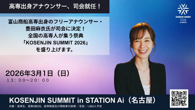 【高専人会】富山商船高専出身のフリーアナウンサー・豊田麻衣氏が司会に決定!全国の高専人が集う祭典「KOSENJIN SUMMIT 2026」を盛り上げます。【3月1日名古屋開催】