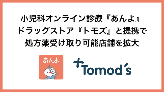 小児科オンライン診療サービス『あんよ』、がドラッグストア『トモズ』と提携で処方薬受け取り可能店舗を拡大