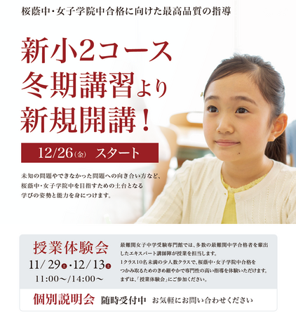 【栄光ゼミナール】最難関女子中学受験専門館、冬期講習より現小学1年生の受付開始!11月29日・12月13日に体験会開催