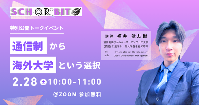 「海外大進学は通信制高校が有利」って本当? オンライン進学校Schorbitが、英国大学・大学院修了の元通信制高校生を招いた特別公開トークイベントを2/28に開催