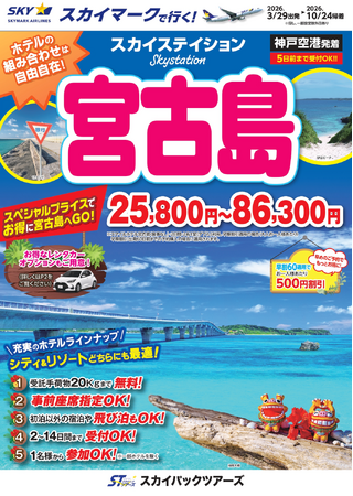 【新商品/神戸空港発着】スカイマークで行く!「スカイステイション 宮古島」を販売開始!25,800円からのスペシャルプライス♪事前座席指定ok!お預け手荷物も20kgまで個数制限なく無料!