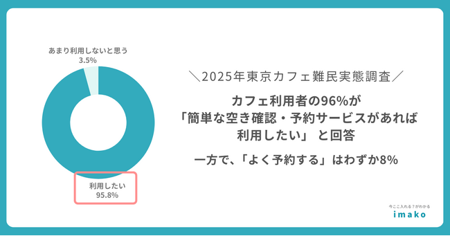 【調査リリース】カフェ利用者の96%が「簡単な空き確認・予約サービスがあれば利用したい」 一方で、予約実施率は低く潜在ニーズと現実に大きなギャップ
