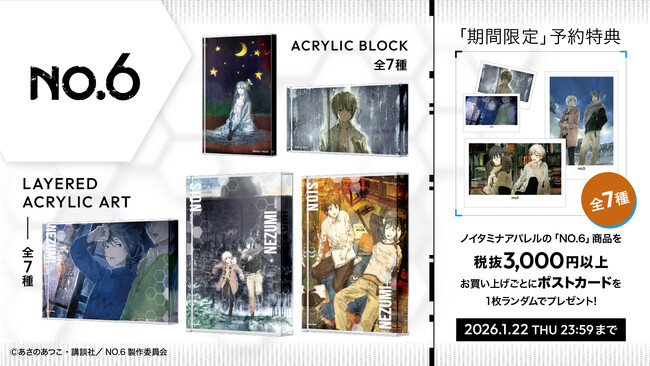TVアニメ「NO.6」より、アニメ放送当時に使用されたtoi8先生描き下ろしの全7種のイラストが商品化。奥行きを楽しめるレイヤードアクリルアート&ブロックになって登場