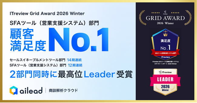 商談解析クラウド ailead、「ITreview Grid Award 2026 Winter」で2部門同時に最高位「Leader」を受賞