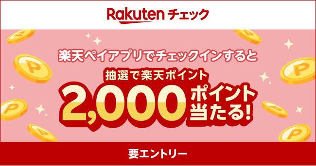 「楽天ペイ」アプリ、「訪問してポイント」からチェックインをすると抽選で2,000ポイントプレゼントキャンペーンを実施