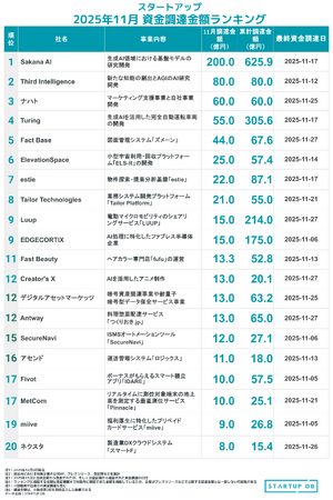 Sakana AIが200億円の調達 ─【STARTUP DB】11月スタートアップ資金調達ランキング─
