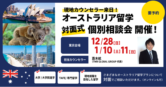 留学支援サービス「Mirai Bridge」、オーストラリア現地在住スタッフが来日、12月・1月に大学・大学院進学・永住権取得や現地就職を目指したオーストラリア留学個別説明会を東京で開催