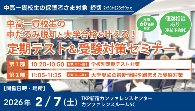 【累計参加者500名突破】中高一貫校生の「中だるみ脱却」と「大学合格」を叶える定期テスト&受験対策セミナー、2月7日(土)に新宿で開催決定!