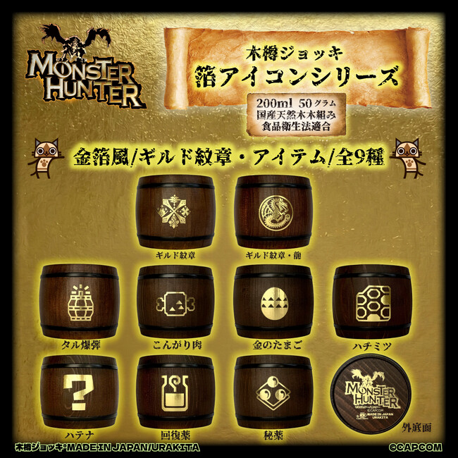 「モンスターハンター」シリーズ「木樽ジョッキ」に《ギルド紋章・アイテムアイコン》 を箔押しした「箔アイコンシリーズ」新登場!