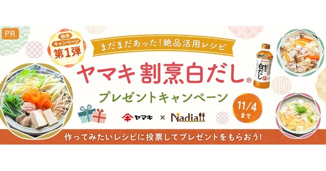 料理メディア「Nadia」とヤマキ株式会社がタイアップ!「ヤマキ 割烹白だし(R)」秋冬プレゼントキャンペーンを開催