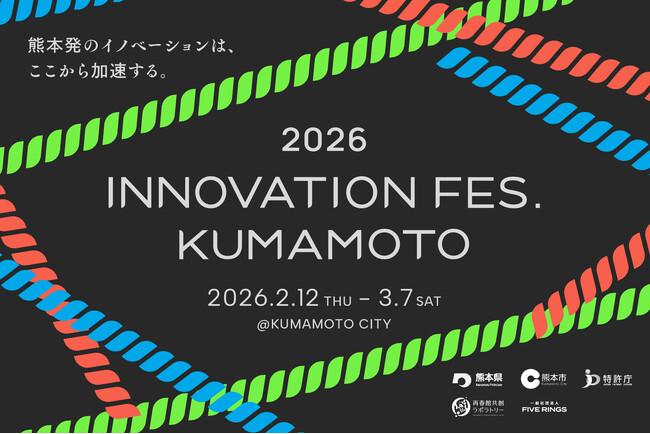 熊本県・熊本市・特許庁・再春館共創ラボラトリー・FIVE RINGSは、新産業やイノベーションを起こすための取り組みとして官民共同で「Innovation Fes. Kumamoto 2026」開催。