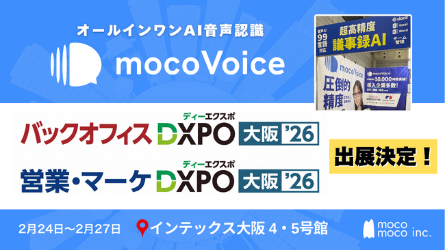 【大好評】音声認識・議事録AI「mocoVoice」が「バックオフィスDXPO 大阪’26」「営業・マーケDXPO 大阪’26」に登場!