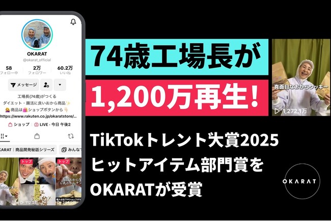 【OKARAT】74歳工場長を中心に「TikTokトレンド大賞2025」 ヒットアイテム部門賞を受賞!真面目なおからクッキーがTikTokやSNSで大ブレイク