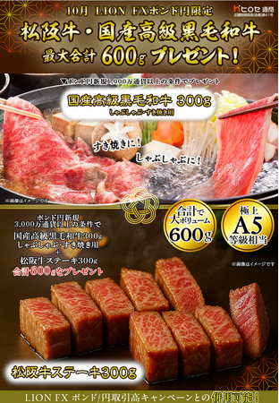 LION FXポンド円限定 松阪牛・国産高級黒毛和牛最大600gプレゼント!を実施!