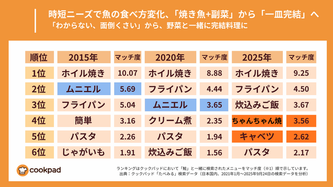 時短ニーズで魚の食べ方変化「焼き魚+副菜」から「一皿完結」へ|クックパッド