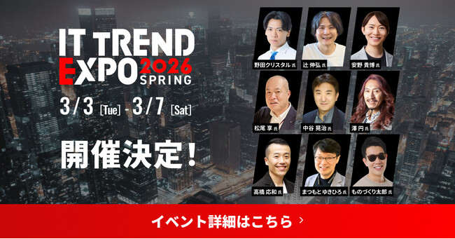 \ 2026年3月3日(火) ~ 7日(土) /全国からオンライン参加可能なITトレンドEXPO2026 Springが来春開催!AI・DX・セキュリティ・バックオフィス効率化の事例を5日間で集中配信