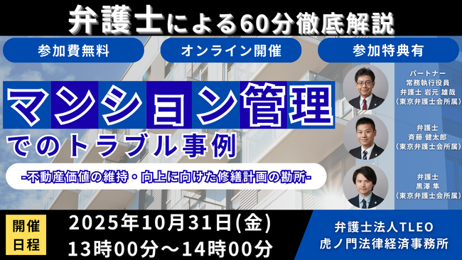 「『マンション管理でのトラブル事例』-不動産価値の維持・向上に向けた修繕計画の勘所-」を無料・オンラインにて開催いたします。