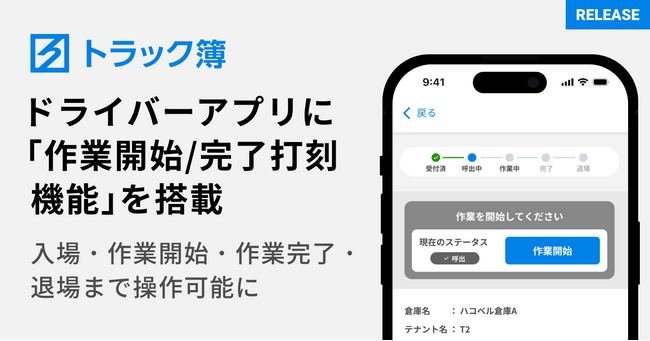 ハコベル、トラック予約/受付システム「トラック簿」のドライバーアプリに「作業開始/完了打刻機能」を搭載