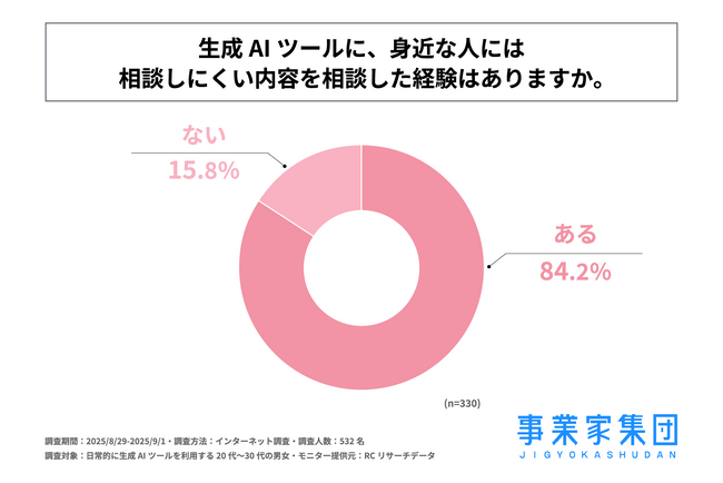 自己理解のために生成AIツールを利用する20代~30代の男女の8割強が、身近な人には相談しにくい内容を生成AIに相談した経験がある!事業家集団が生成AIツールを利用した自己理解の実態に関する調査実施!