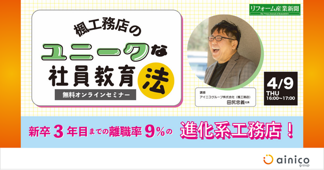 【無料オンラインセミナー<4/9>】新卒3年目までの離職率9%の進化系工務店~楓工務店のユニークな社員教育法~