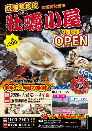 冬季限定の人気イベント!!炭火でじっくり、冬のごちそう。本格牡蠣小屋が服部緑地で3年目の開催決定!!