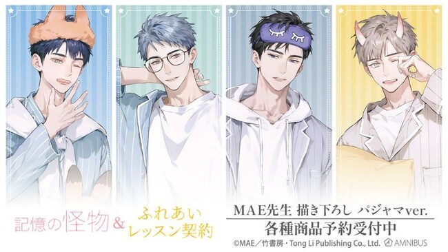 「記憶の怪物」&「ふれあいレッスン契約」のMAE先生 描き下ろし パジャマver. トレーディンググリッター缶バッジなどの受注を開始!!アニメ・漫画のオリジナルグッズを販売する「AMNIBUS」にて