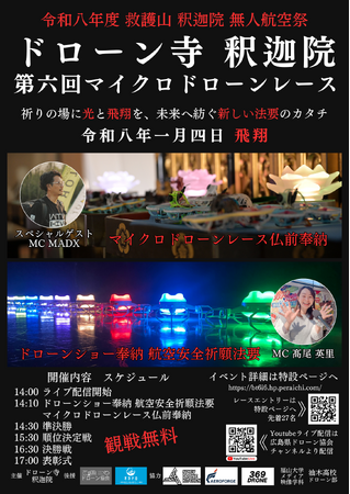 【広島県府中市】ドローン寺 釈迦院、「無人航空祭」を開催。幻想的な「本堂内ドローンショー奉納」と「第6回マイクロドローンレース」を2026年1月4日に実施