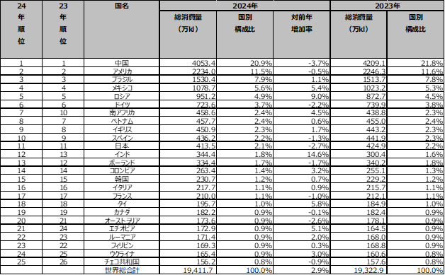 「2024年 世界主要国のビール消費量」引き続き中国が首位、総消費量は2023年より微増。