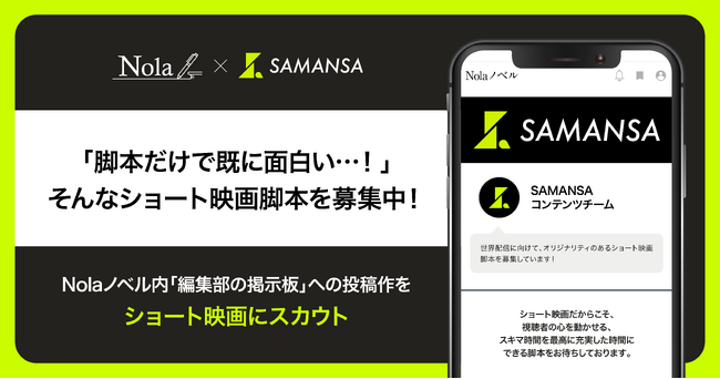 作家数60万人超・作品数250万超の創作プラットフォーム「Nola」、SAMANSAコンテンツチームとともに、“ショート映画脚本”の募集を開始!