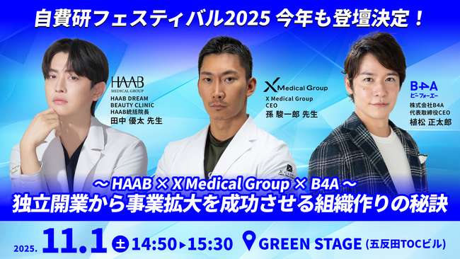 11/1(土) 自費研フェスティバル GREEN STAGEにB4Aが登壇【~HAAB × X Medical Group × B4A~独立開業から事業拡大を成功させる組織作りの秘訣】