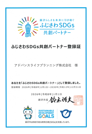 アドバンスライフプランニング株式会社、「ふじさわSDGs共創パートナー」に登録 ~「家族のいない方の家族になる」を掲げ、高齢者が安心して暮らせる地域づくりと空き家予防に貢献~